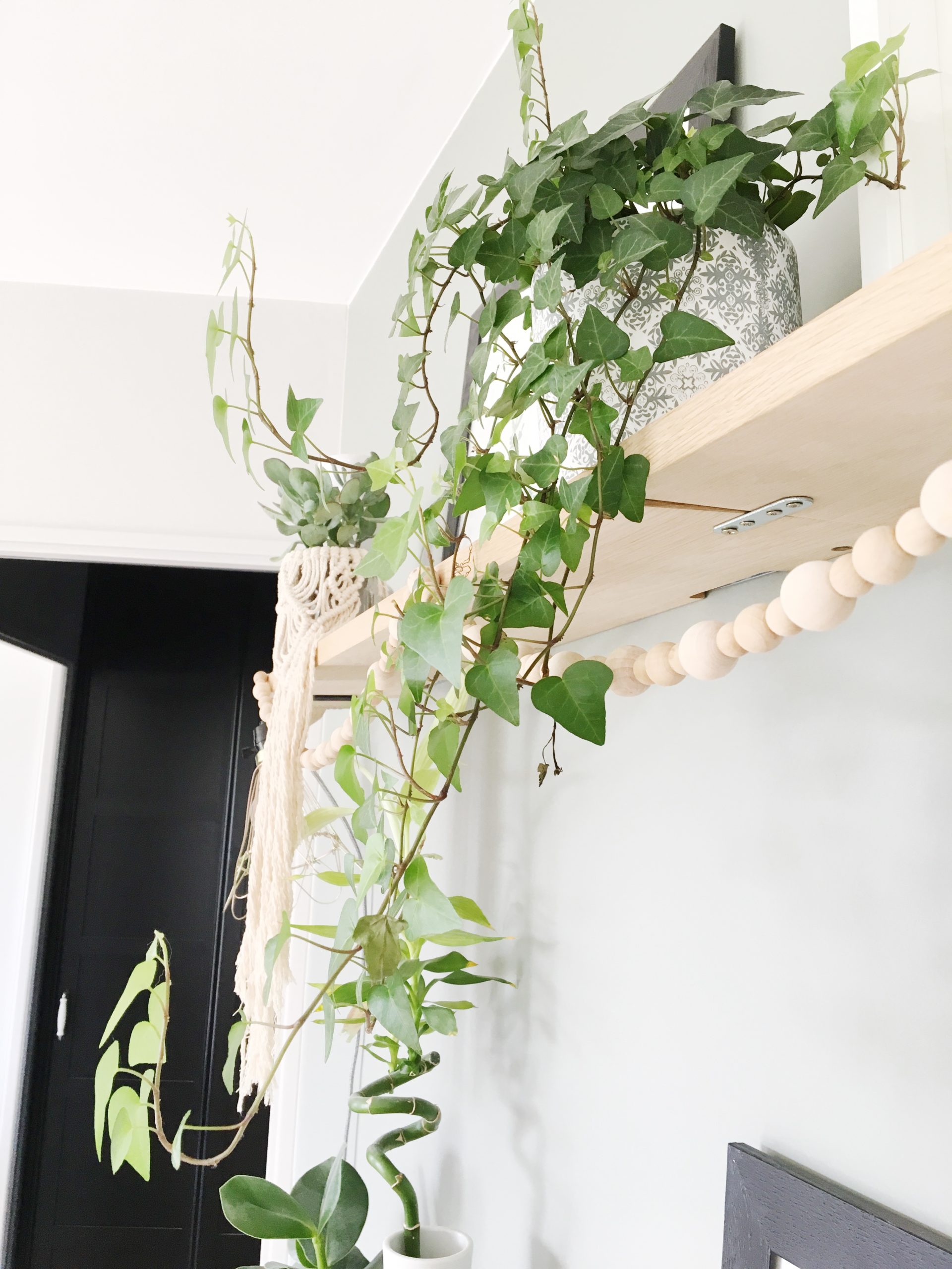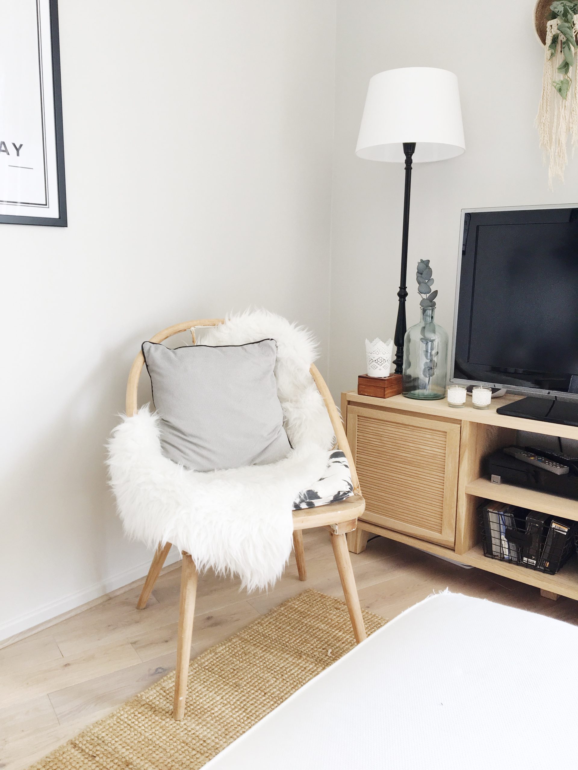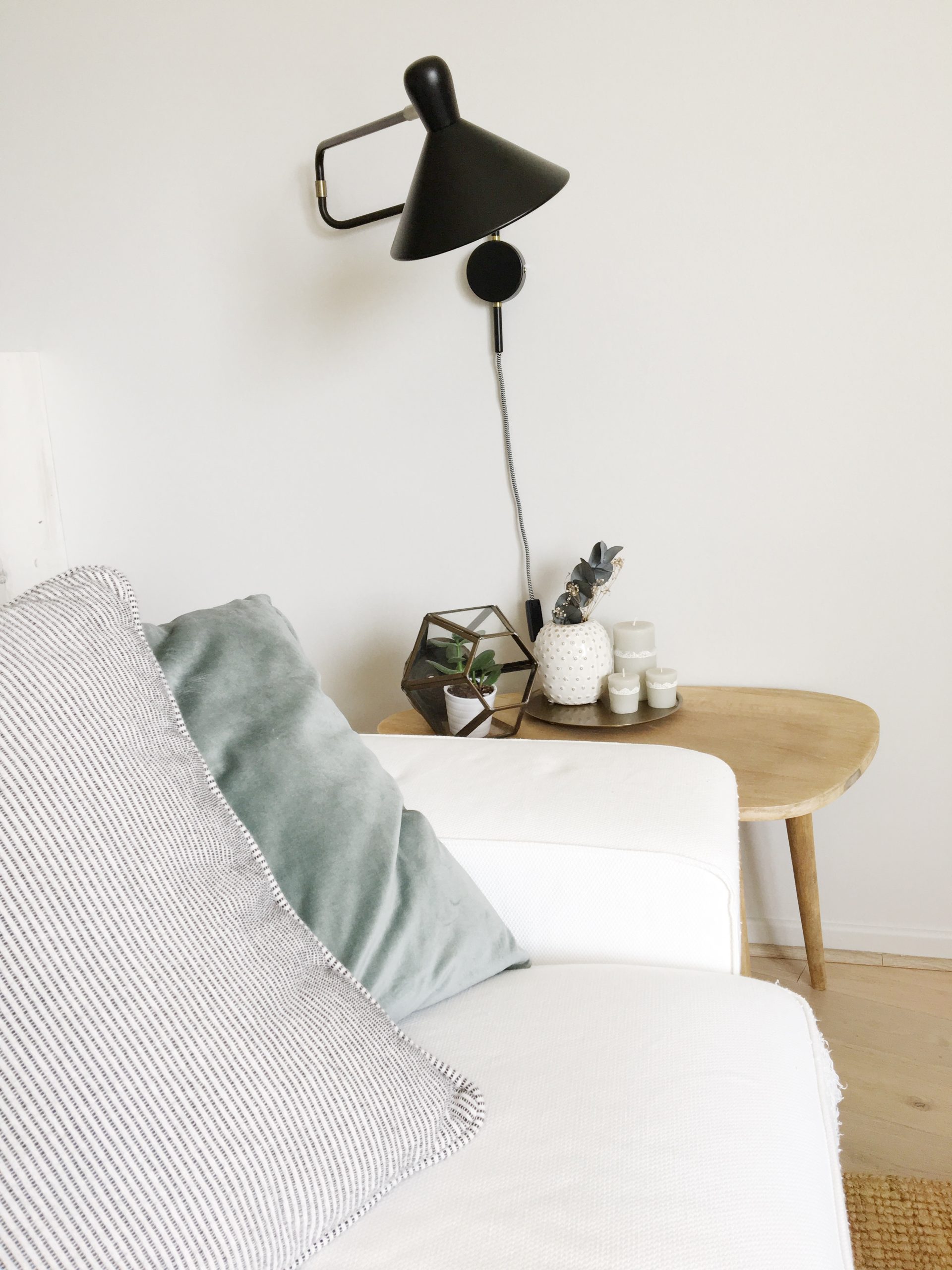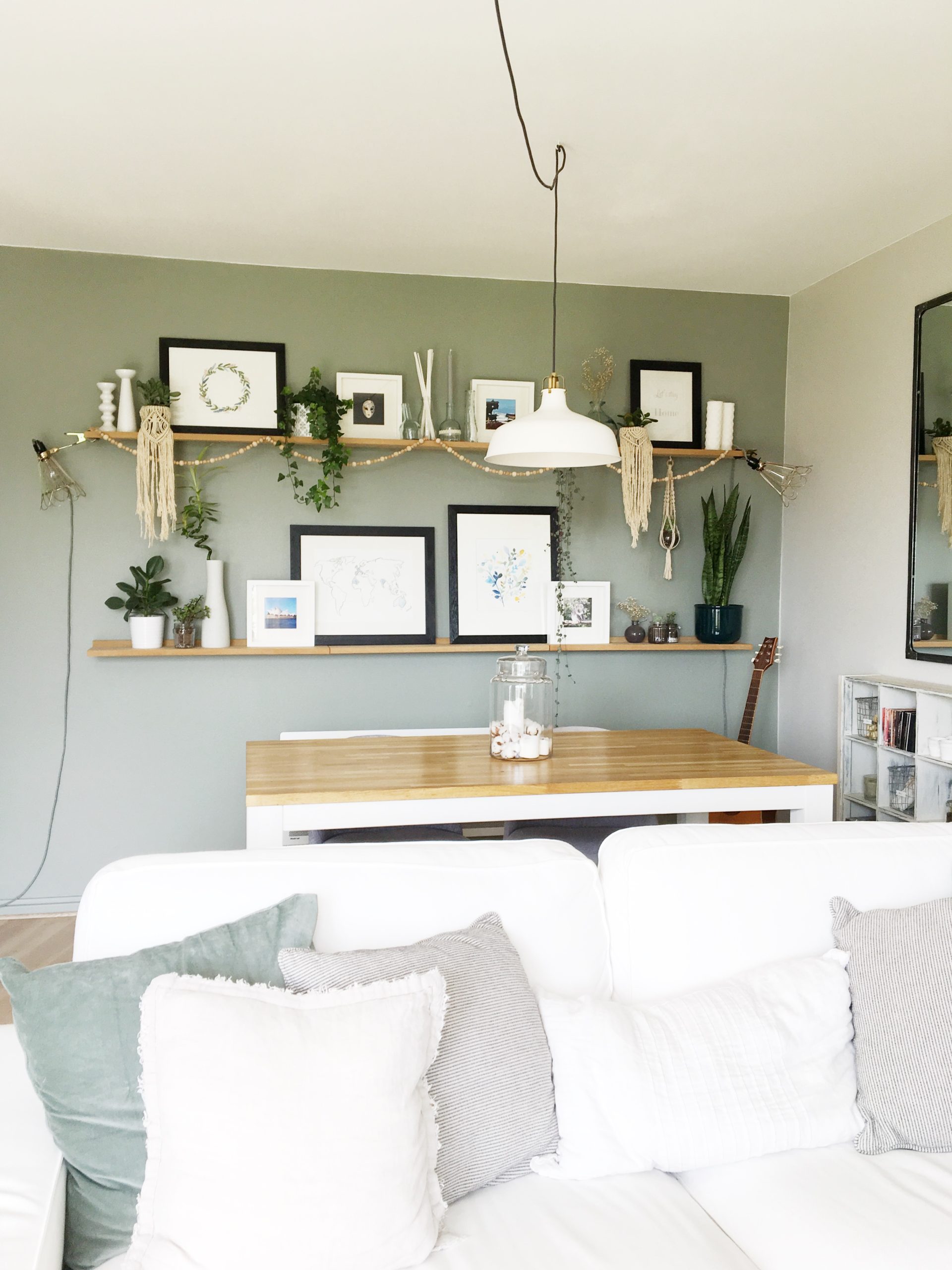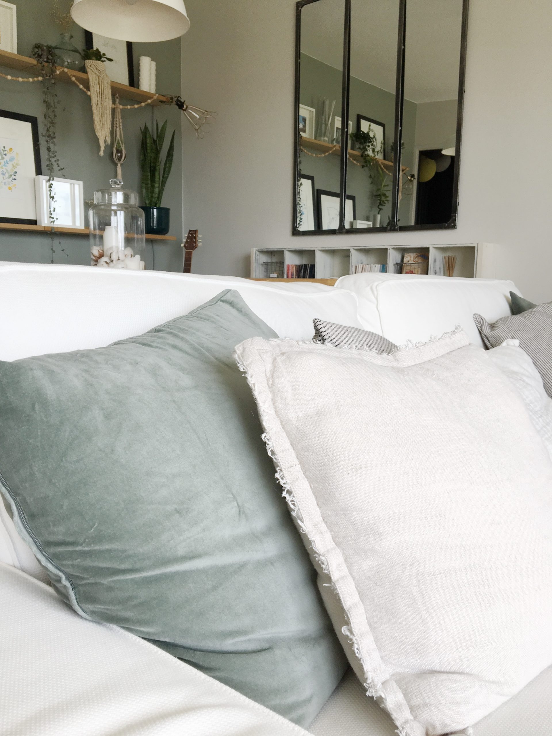 J’avais très envie de faire entrer la nature dans mon salon et de mettre des touches de vert grâce aux plantes (= Green). Je voulais également créer un mur d’accent d’une couleur bleu/vert/gris, tout cela dans une ambiance détendue, apaisante, conviviale et originale (= Folk).