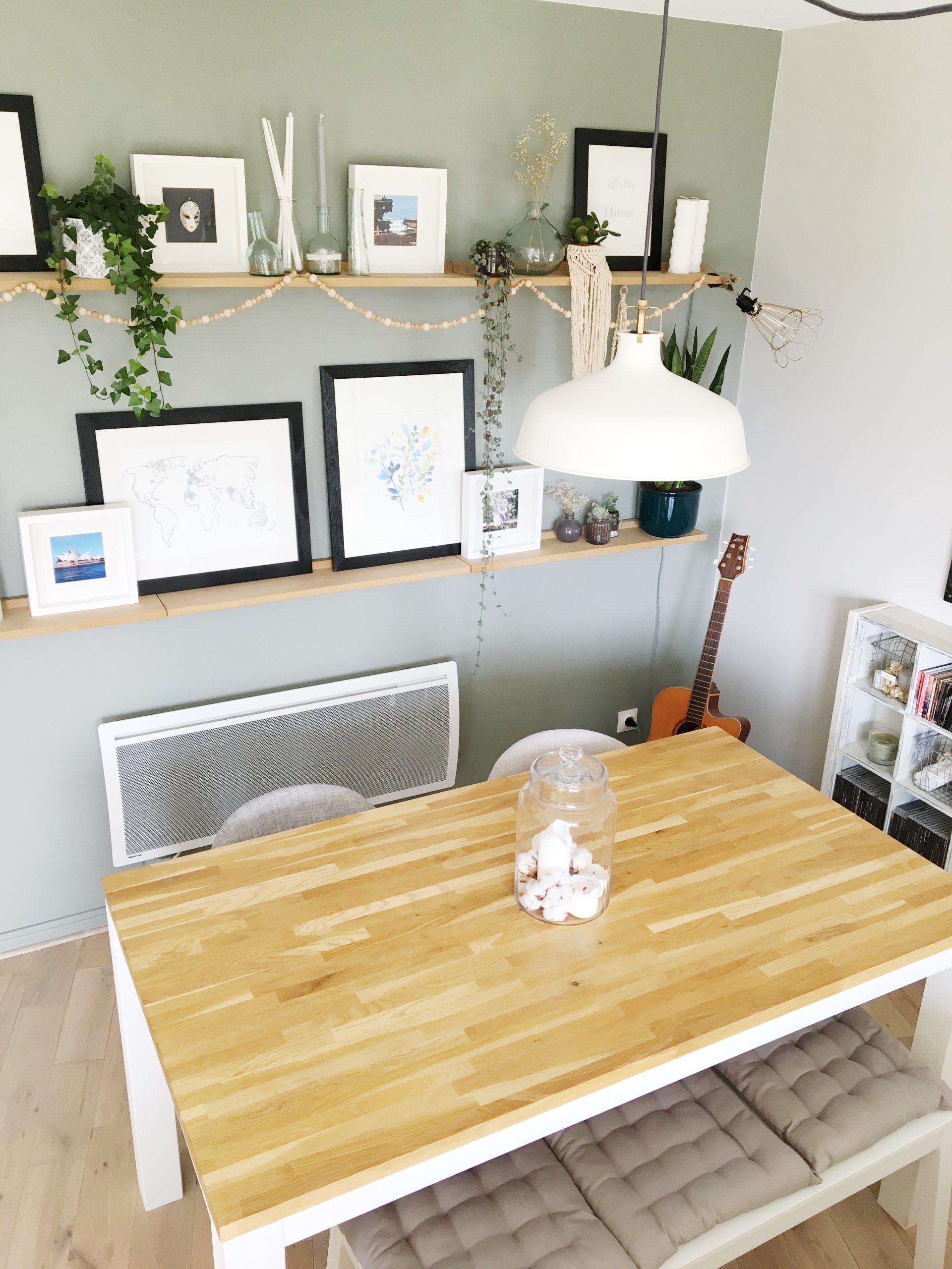 - sur les étagères : cadres Ikea et Leroy Merlin, vases en verre trouvés chez Alinéa et objets chinés