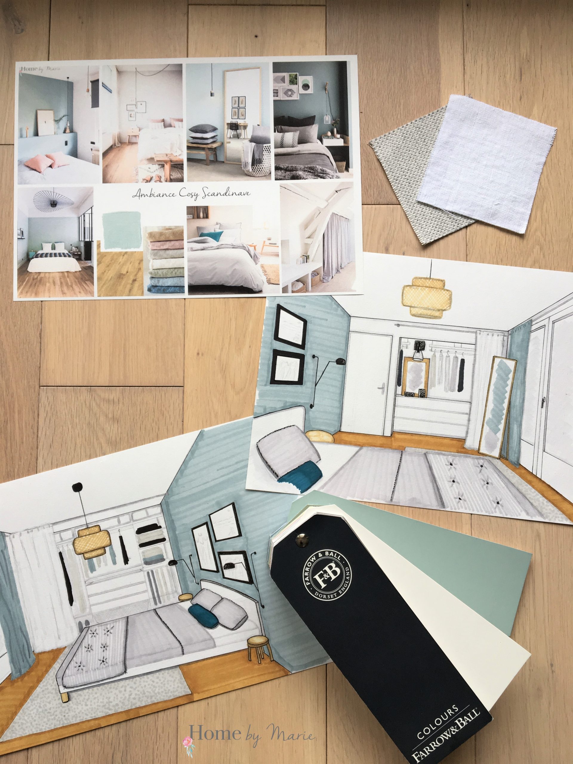 Carole et Sylvain m’ont demandé de les conseiller pour l’aménagement et la décoration de leur chambre parentale. Ils aiment le style scandinave, le bois clair, les couleurs pastels et notamment la couleur bleu/vert. Ils voulaient créer des rangements sur tout un mur dans la chambre et la rendre plus cosy.