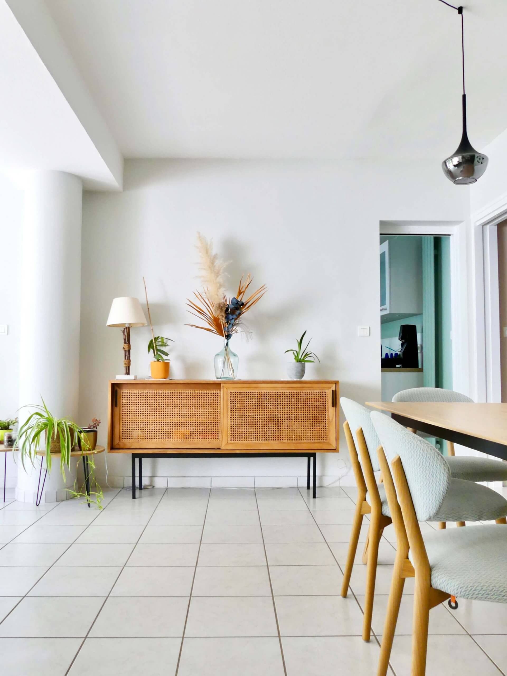 Tout d’abord, le salon principal se distingue par un agencement tourné vers la lumière naturelle et la vue extérieure. La disposition du canapé rend la circulation fluide entre l’espace salle à manger, la cuisine ainsi que le petit salon. Les textures choisies comme le lin, le jute ou le cannage apportent du relief et de la chaleur. Des luminaires suspendus au design sculptural viennent ponctuer la hauteur sous plafond, soulignant ainsi le caractère atypique du lieu.