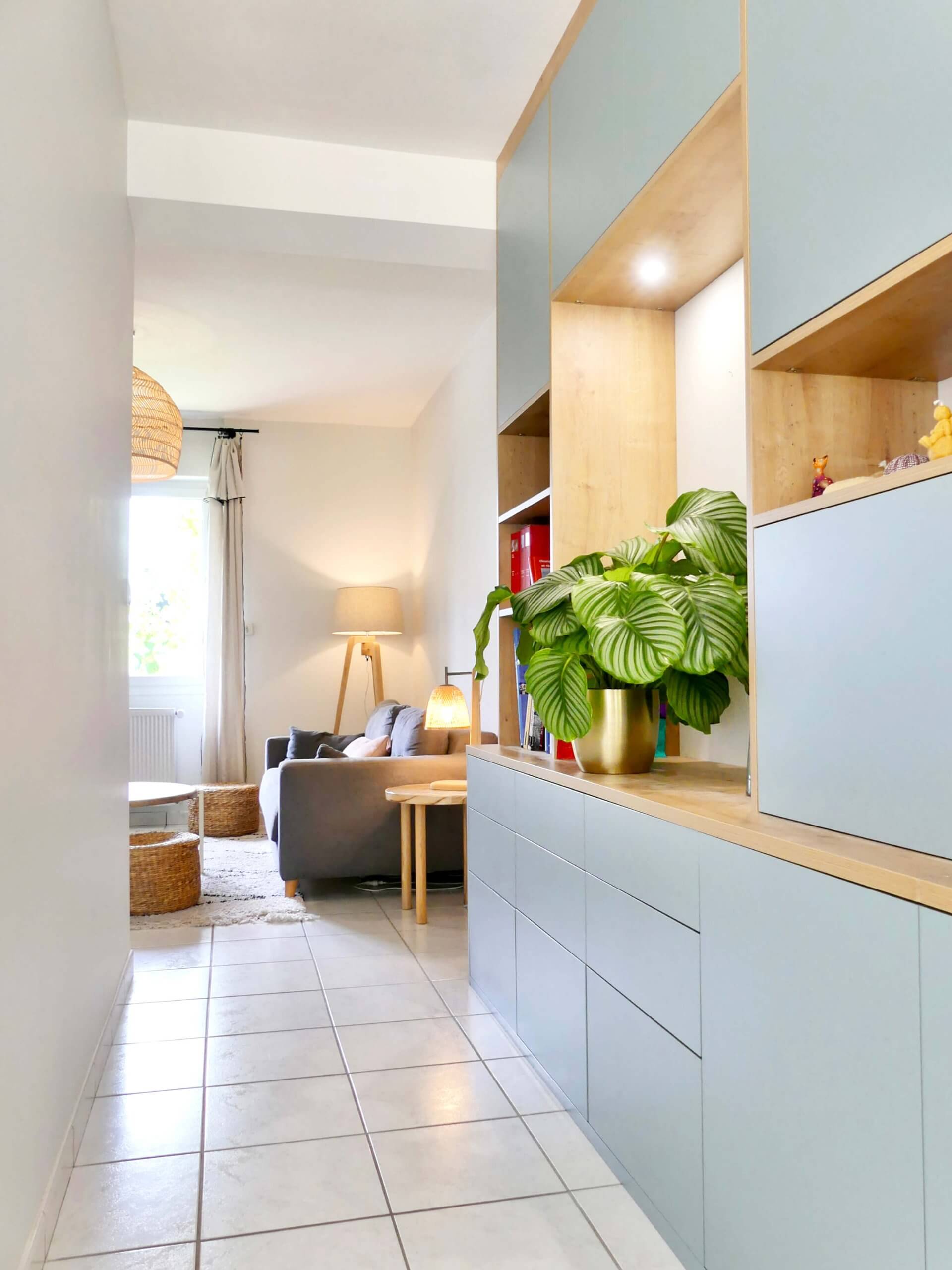 Malgré une surface réduite, l’aménagement de l’entrée a été pensé pour conjuguer fonctionnalité et esthétisme. Les rangements sont prévus pour accueillir les essentiels du quotidien. Tandis qu’un miroir et une petite niche avec verrière réfléchissent la lumière des autres pièces, ce qui agrandit visuellement l’espace. Ainsi, cette transition douce mène vers le grand séjour, baigné de lumière grâce à de larges ouvertures donnant sur le jardin.