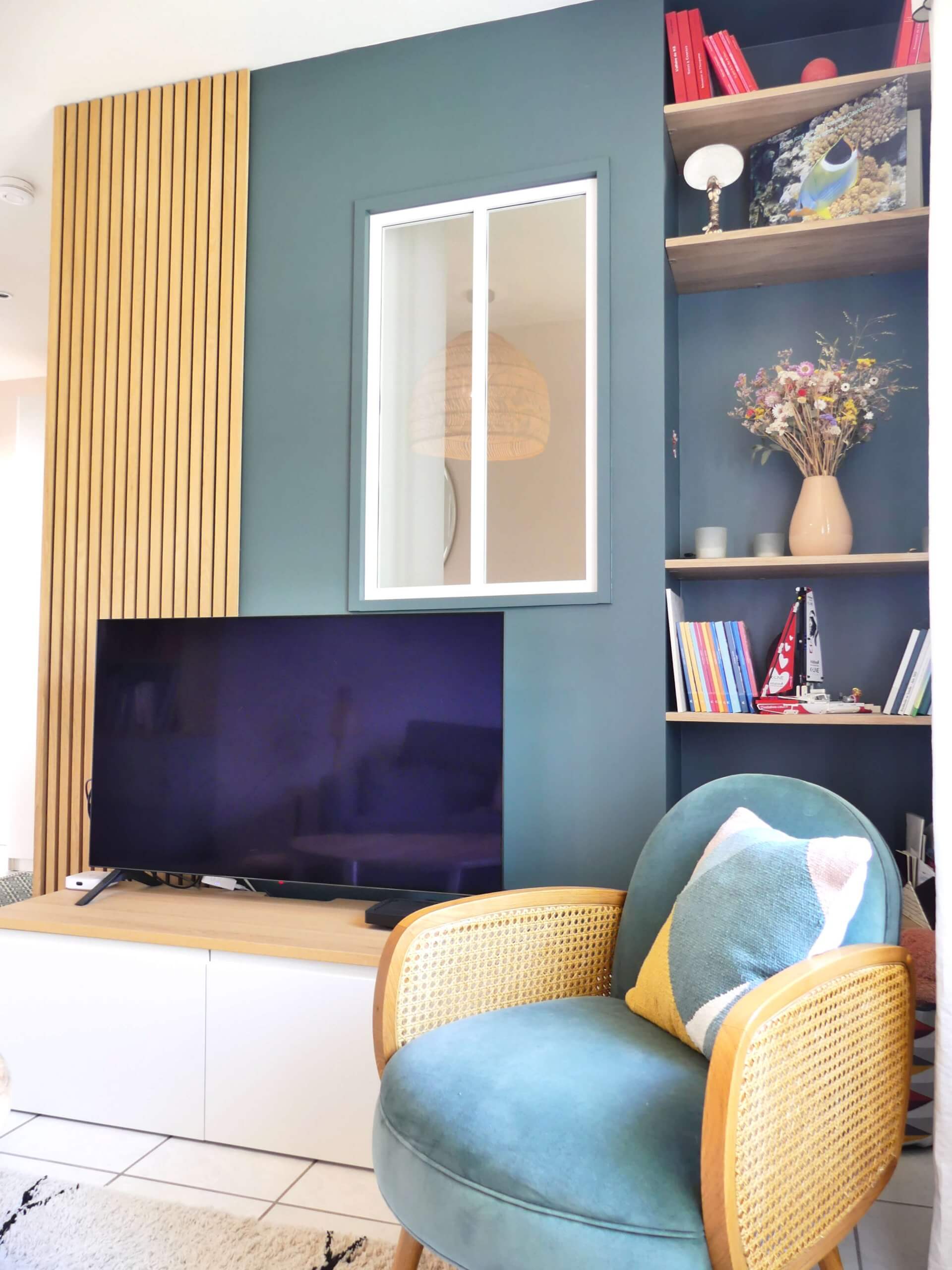 Pour terminer, un petit salon TV a été créé dans l’ancien espace salon. Pensé comme un cocon, on y trouve des tons plus soutenus, des textiles doux et un éclairage tamisé. L’ensemble donne donc un espace intime et propice à la détente.