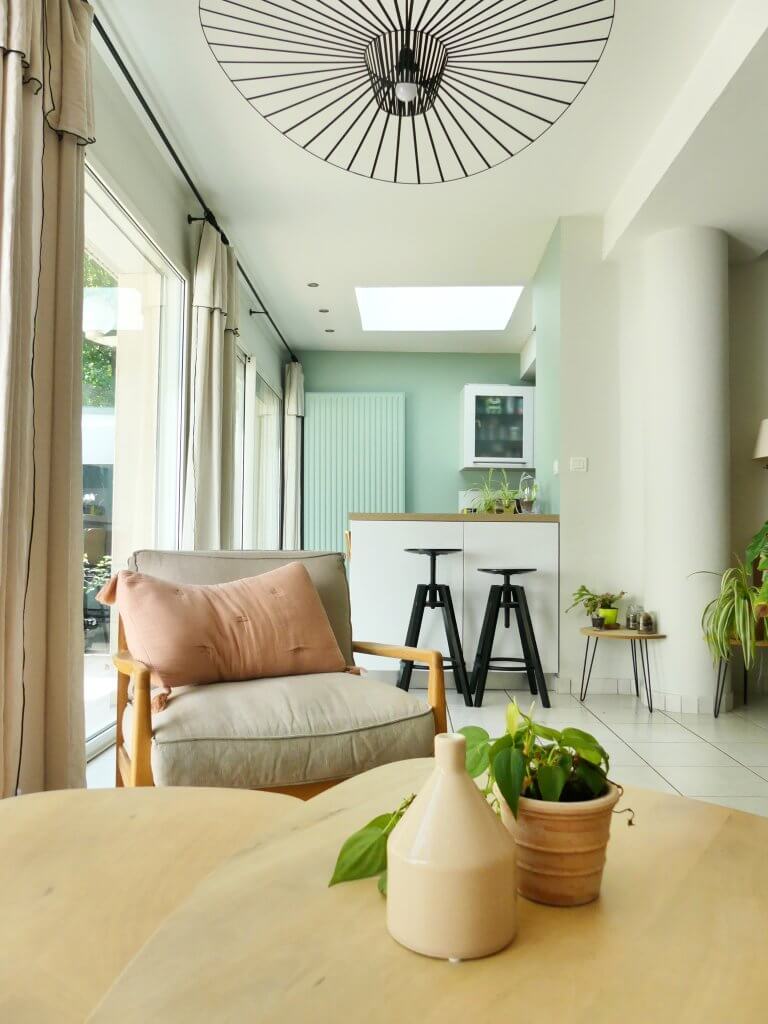 Enfin, la cuisine a également subi un relooking puisque nous avons choisi une couleur en harmonie avec l’ensemble pour repeindre les murs. Par ailleurs, l’espace bar a été ajouté afin de pouvoir accueillir les repas quotidien de la famille.